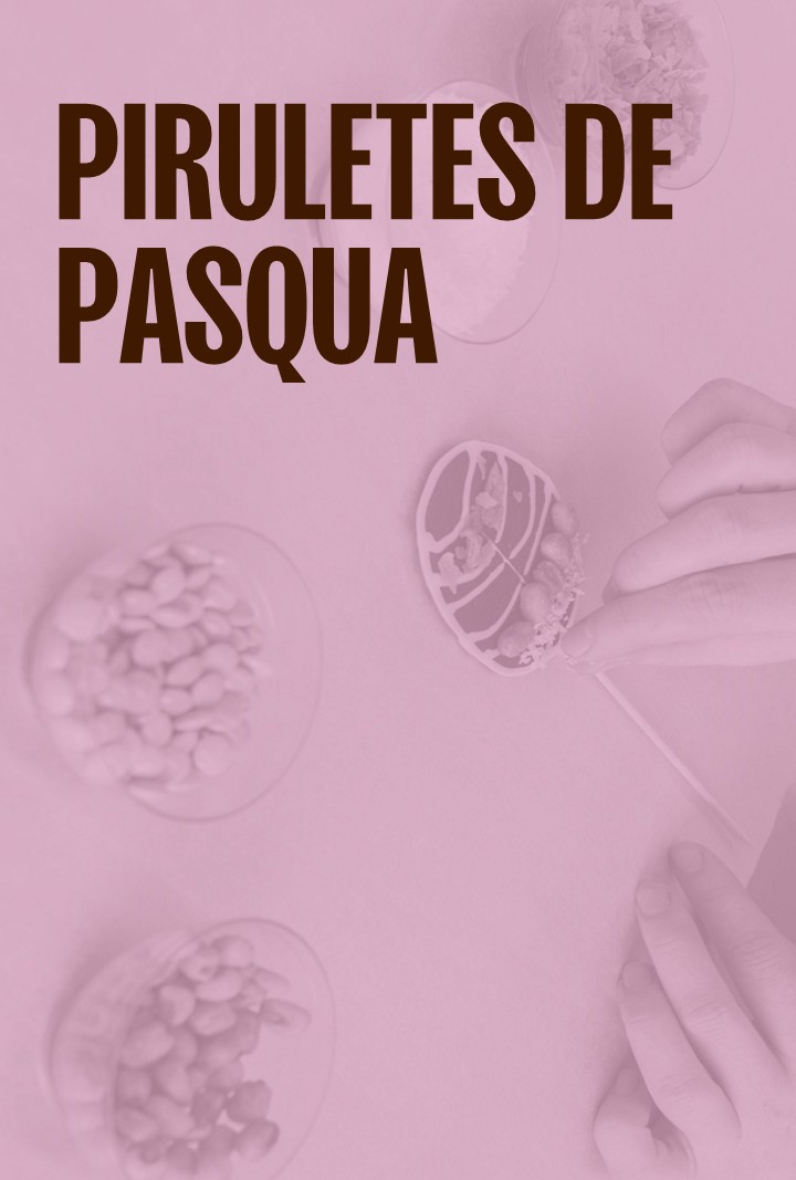 Taller pràctic de xocolateria basat en l’elaboració de piruletes de Pasqua. Utilitzarem la mànega pastissera i el cornet per crear piruletes totalment personalitzades, jugant amb colors, textures i formes diferents. A més a més de xocolata, usarem diferents ingredients i decoracions comestibles que complementen o contrasten amb els sabors del cacau.